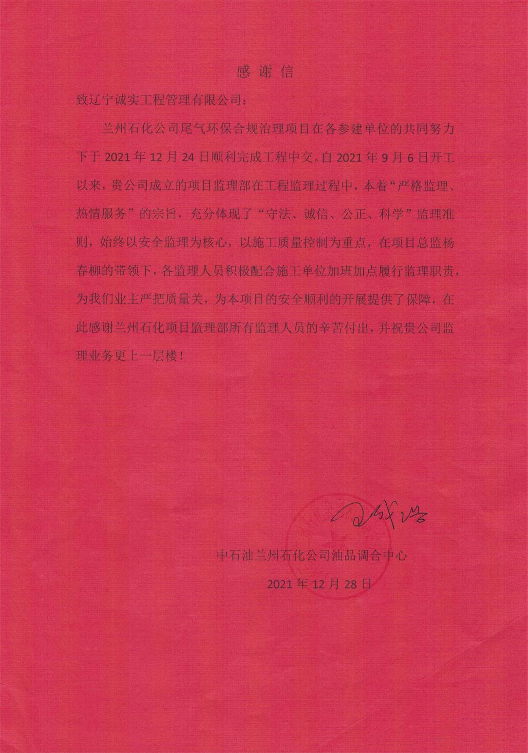 12月28日,蘭州項目監(jiān)理部收到中石油蘭州石化公司油品調(diào)合中心發(fā)來的感謝信。信中,業(yè)主單位對項目部全體監(jiān)理人員在項目開展過程中的工作表現(xiàn)給予了充分的肯定和高度的贊譽。這是對我公司卓越的項目管理水平和強大的人才隊伍的最好見證,同時也完美的展現(xiàn)了我們一貫以來“敢打硬仗、善打難仗、能打勝仗”的優(yōu)良傳統(tǒng)和作風(fēng)。希望各項目部要以此為動力,不忘初心,牢記使命,擔(dān)當(dāng)作為,為樹立誠實品牌、打造誠實形象再立新功!