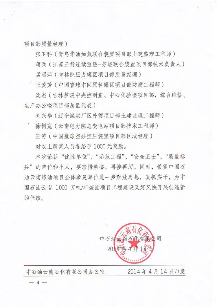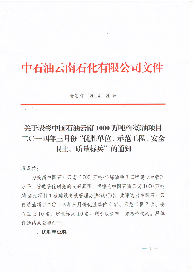 我公司榮獲中國(guó)石油云南1000萬(wàn)噸/年煉油項(xiàng)目2014年3月份“優(yōu)勝單位”榮譽(yù)稱號(hào)!