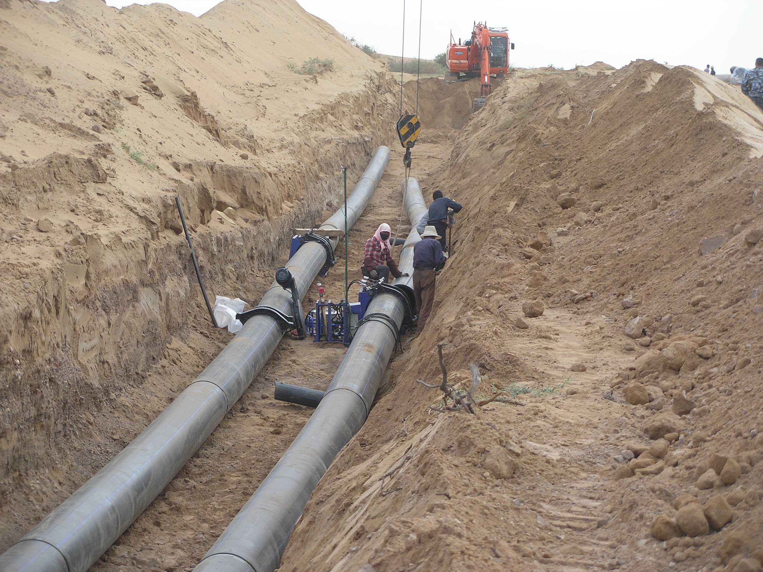 巴二建在主管線敷設(shè)已熔接好的DN500PE管
